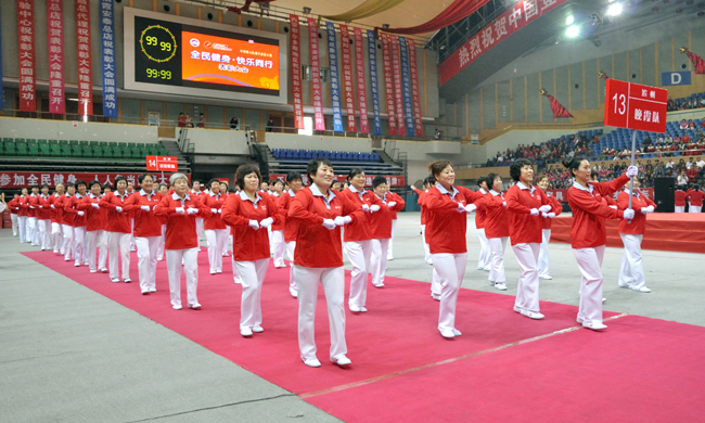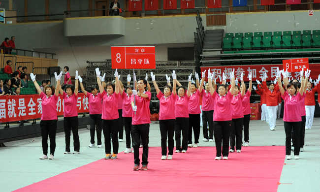 北京昌平隊 從選拔、備戰(zhàn)到今天的總決賽,一路走來,參賽隊員們的動作越來越熟練,越來越標(biāo)準(zhǔn),團(tuán)隊凝聚力越來越強(qiáng)。這些活力十足的中老年朋友并沒有滿足于越跳越熟練這一標(biāo)準(zhǔn),不少參賽隊伍在原有健身操基礎(chǔ)上又添加了一些新的成分。充滿個性的隊名、色彩鮮艷的運(yùn)動裝、揮舞的彩旗等創(chuàng)意,在總決賽的舞臺上給所有觀眾打造了一臺視覺盛宴,讓參賽節(jié)目更有看頭。賽場上,參賽隊員的展示非常到位,微笑始終掛在臉上,就連賽前的口號都是精心準(zhǔn)備、反復(fù)推敲。活力無限的她們感染了舞臺下的每一位觀眾,現(xiàn)場觀眾都在用自己最熱烈掌聲、最大的歡呼聲表達(dá)著對參賽選手的喜愛和尊重。 |